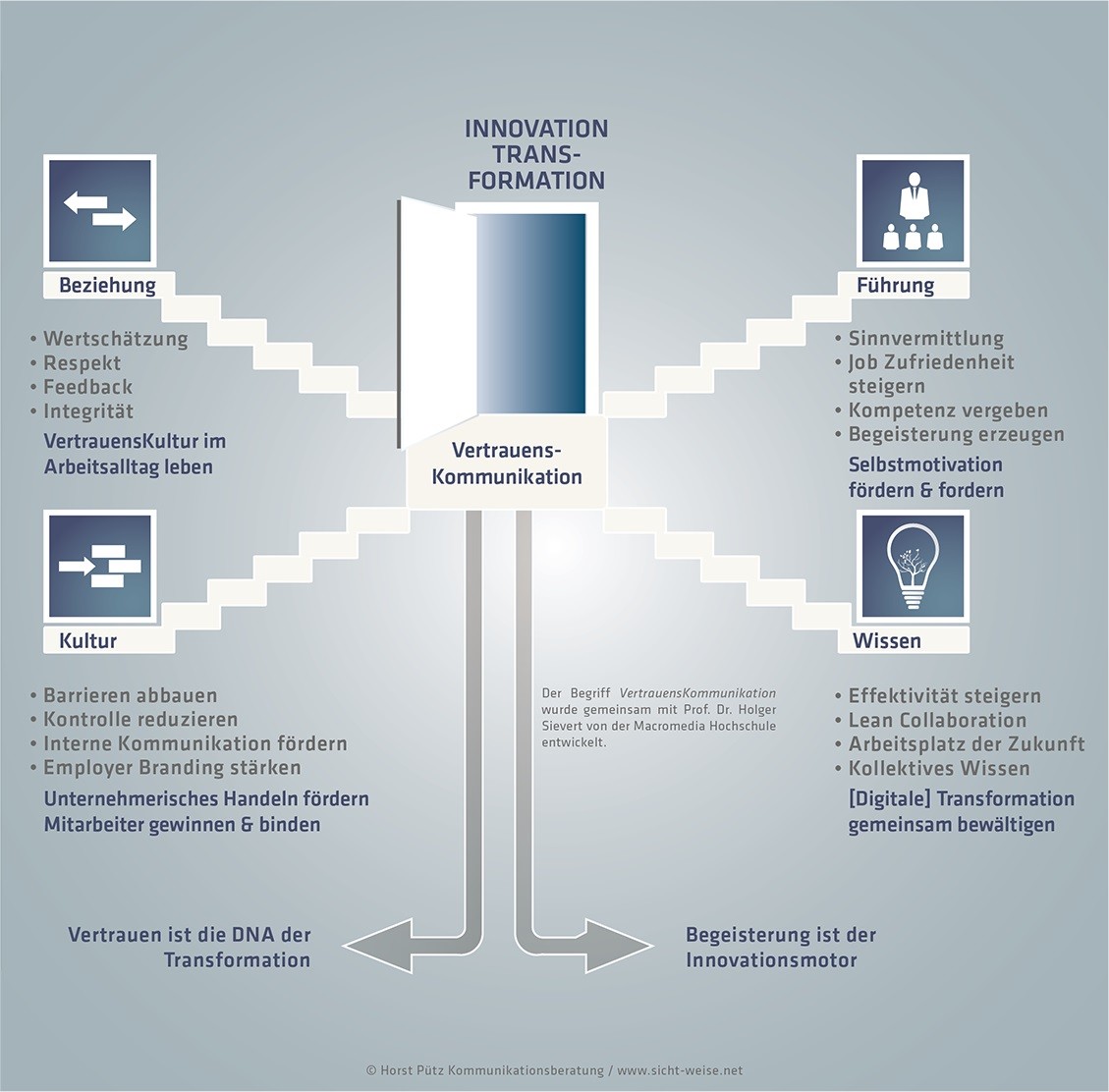 In den Mittelpunkt aller Unternehmen rückt also die Fragestellung, wie diese Veränderungen erfolgreich bewältigt werden können. Veränderungen setzen voraus, dass neue, mutige Gedanken und Denkweisen zugelassen und aktiv gefördert werden, denn daraus entsteht Innovation und Zukunftssicherung. Der Abbau von Barrieren, Silodenken und Herrschaftswissen durch Sinnhaftigkeit, Eigenverantwortung und Eigenmotivation schaffen eine lebendige, lernende Atmosphäre. Eine Atmosphäre, die durch Wertschätzung, Respekt und eine Feedbackkultur ermöglicht, dass sich Management und Mitarbeiter trauen, anders zu denken.