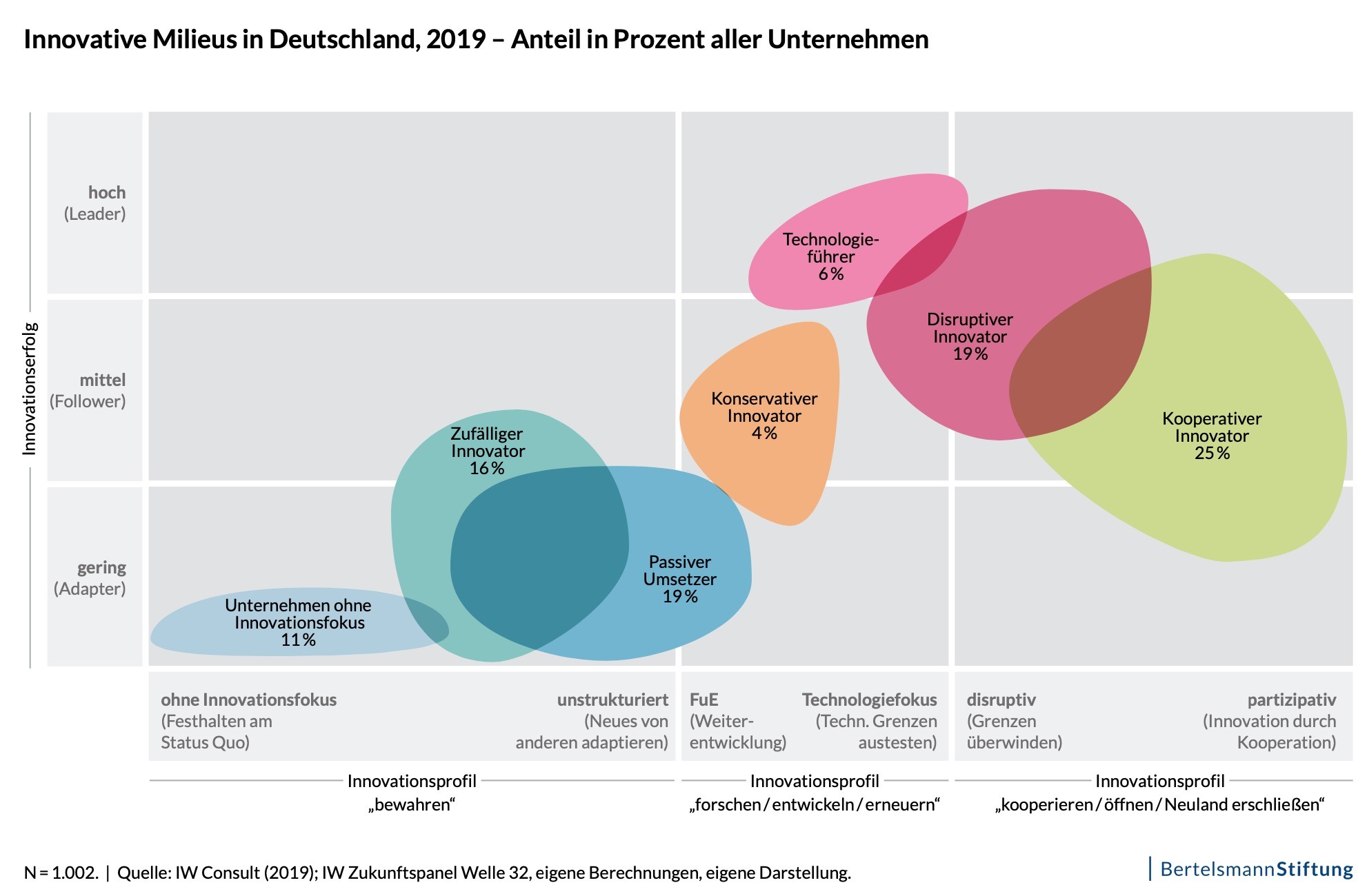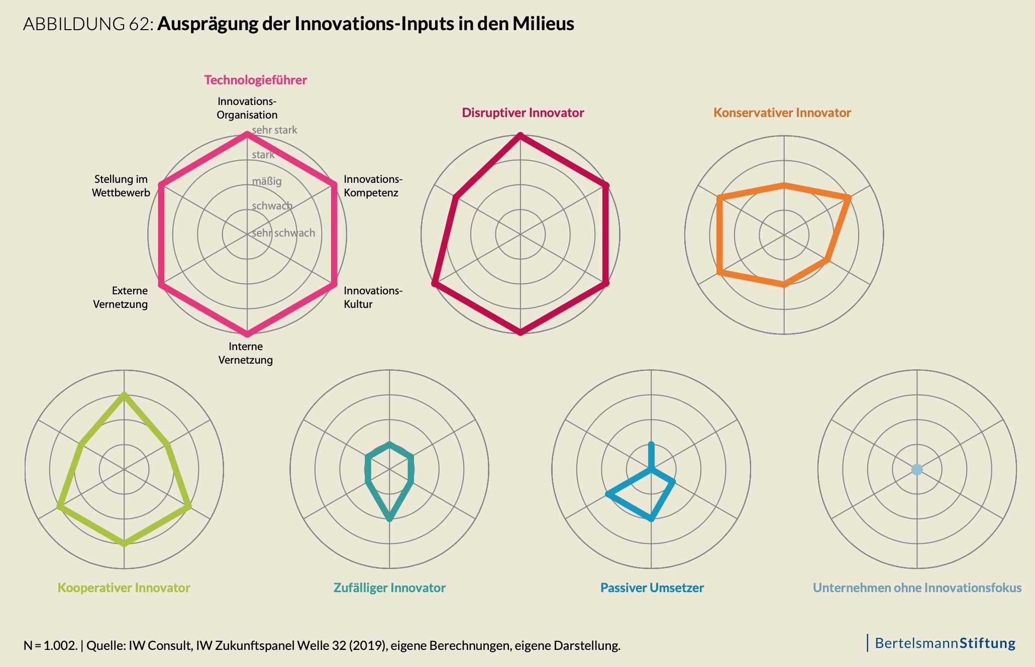 An der Spitze der Innovationsdynamik stehen Technologieführer, die die technologischen Grenzen immer weiter – auch mit Hilfe vieler eigener Patente – nach vorn verschieben. Naturgemäß besitzen sie einen starken Wissenschaftsfokus bei ihrer Tätigkeit. Jedoch gehören am Ende nur 6% der Unternehmen diesem Milieu an. Chemie, Pharma, Kunststoff, Metall- und Elektroindustrie bilden die Branchenschwerpunkte. Sowohl sehr große Unternehmen als auch StartUps sind deutlich überrepräsentiert. Diesen Innovationsvorbildern folgen dann disruptive, konservative, kooperative und zufällige Innovatoren, die sich allesamt in ihrer Zielgerichtetheit und der Schwerpunktsetzung ihrer internen Ressourcenverwendung unterscheiden (in der Studie findet sich umfangreiches Datenmaterial zu den Merkmalsausprägungen der unterschiedlichen Innovationsmilieus).