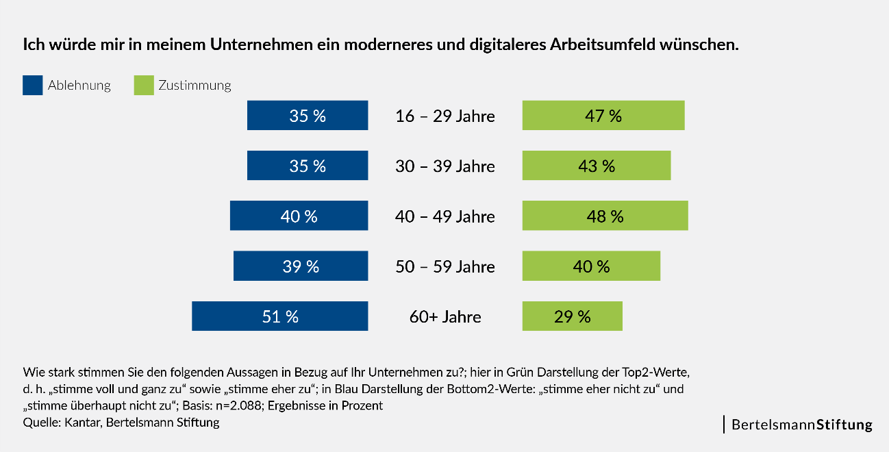 Über alle Altersgruppen hinweg attestieren die Befragten ihrem Arbeitsumfeld eine grundsätzliche Offenheit gegenüber der Digitalisierung. Beim Wunsch nach digitalerem Arbeiten und bei der Einschätzung des Potenzials und Nutzens der digitalen Transformation nimmt die jüngere Generation eine deutlich forderndere und positivere Haltung ein als ältere Altersgruppen. Wünschen sich 47 Prozent der 16- bis 29-jährigen Erwerbstätigen ein moderneres und digitaleres Arbeitsumfeld, so lehnt die Hälfte der über 60-Jährigen (51 Prozent) dies ab. Es ist daher anzunehmen, dass die betriebliche digitale Transformation zunehmend an Dynamik gewinnen wird, je mehr jüngere Menschen, die der Digitalisierung gegenüber aufgeschlossener sind, in Entscheiderpositionen kommen.