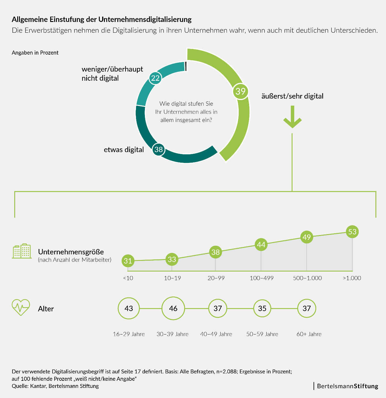 - Knapp 40 Prozent der Erwerbstätigen in Deutschland bewerten ihr eigenes Unternehmen als äußerst bzw. sehr digital. Dieses Ergebnis macht deutlich, dass die Digitalisierung aus Sicht der Erwerbstätigen in den deutschen Unternehmen angekommen ist. Gleichzeitig bedeutet dies jedoch auch, dass 60 Prozent der Befragten ihr Unternehmen nicht als digital fortgeschritten wahrnehmen. So geben 38 Prozent an, dass sie in einem „etwas digitalen“ Umfeld arbeiten. Ganze 22 Prozent der Befragten und somit jeder fünfte Erwerbstätige sagen, dass ihr Unternehmen kaum bzw. noch nicht in der digitalen Welt angekommen ist.