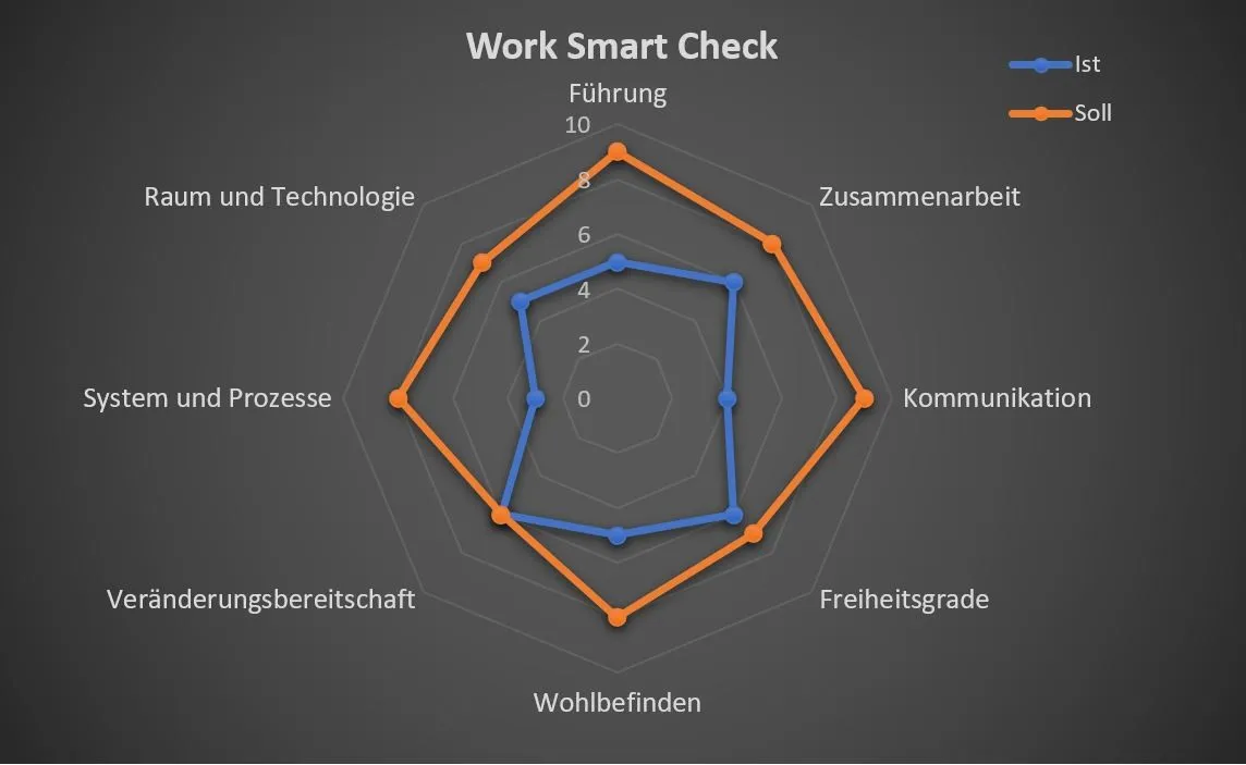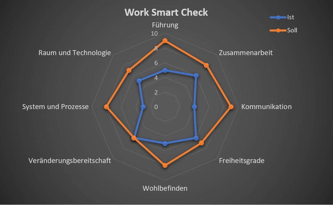 Der Work Smart Check kann in regelmäßigen Abständen wiederholt werden. Führen die umgesetzten Maßnahmen zu messbaren Veränderungen lässt sich dieses anhand der Ist-Werte sowie aus den Differenzen der Ist- und Soll-Werte ermitteln. Zugleich können auch bei mehrfacher Wiederholung des Work Smart Checks immer wieder neue und für das Team aktuell relevante Stellschrauben ermittelt werden, sodass die stetige Weiterentwicklung gefördert wird.