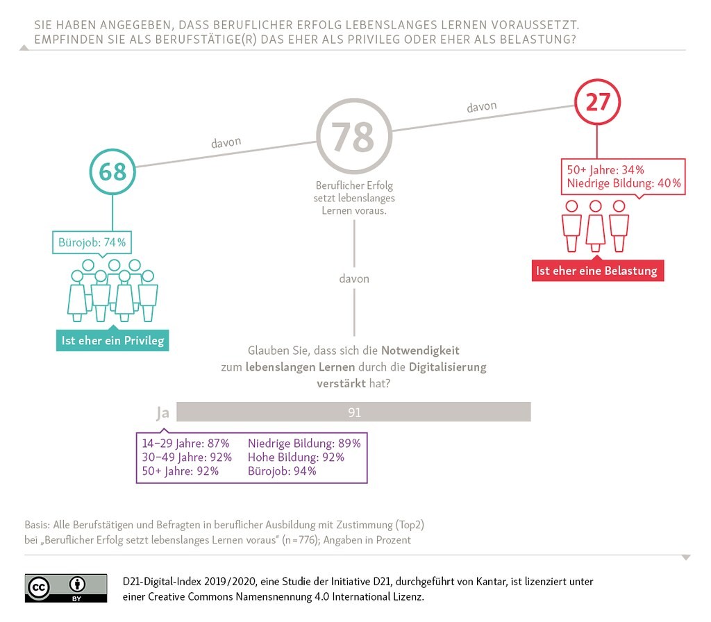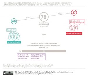 Drei von vier Beschäftigten sind sich bewusst, dass beruflicher Erfolg lebenslanges Lernen voraussetzt. 69 % der Bevölkerung meinen, dass Digitalisierung stärker im Studium und der beruflichen Ausbildung verankert werden müsste. 68 % sagen, dass beruflicher Erfolg zukünftig definitiv voraussetzt, mit den Entwicklung der Digitalisierung Schritt halten zu können. Jeder zweite Beschäftigte in Deutschland hat ein großes Interesse daran, moderne digitale Technologien bei seiner Arbeit einzusetzen; im Bereich der Bürojobs sind es sogar zwei Drittel der Beschäftigten. Es ist daher vor allen Dingen an den Arbeitgebern, diese Potenziale zu nutzen, indem digitale Fortbildung, mobiles Arbeiten und die Umsetzung einer offenen digitalen Arbeitskultur zum Alltag und zur Selbstverständlichkeit werden.