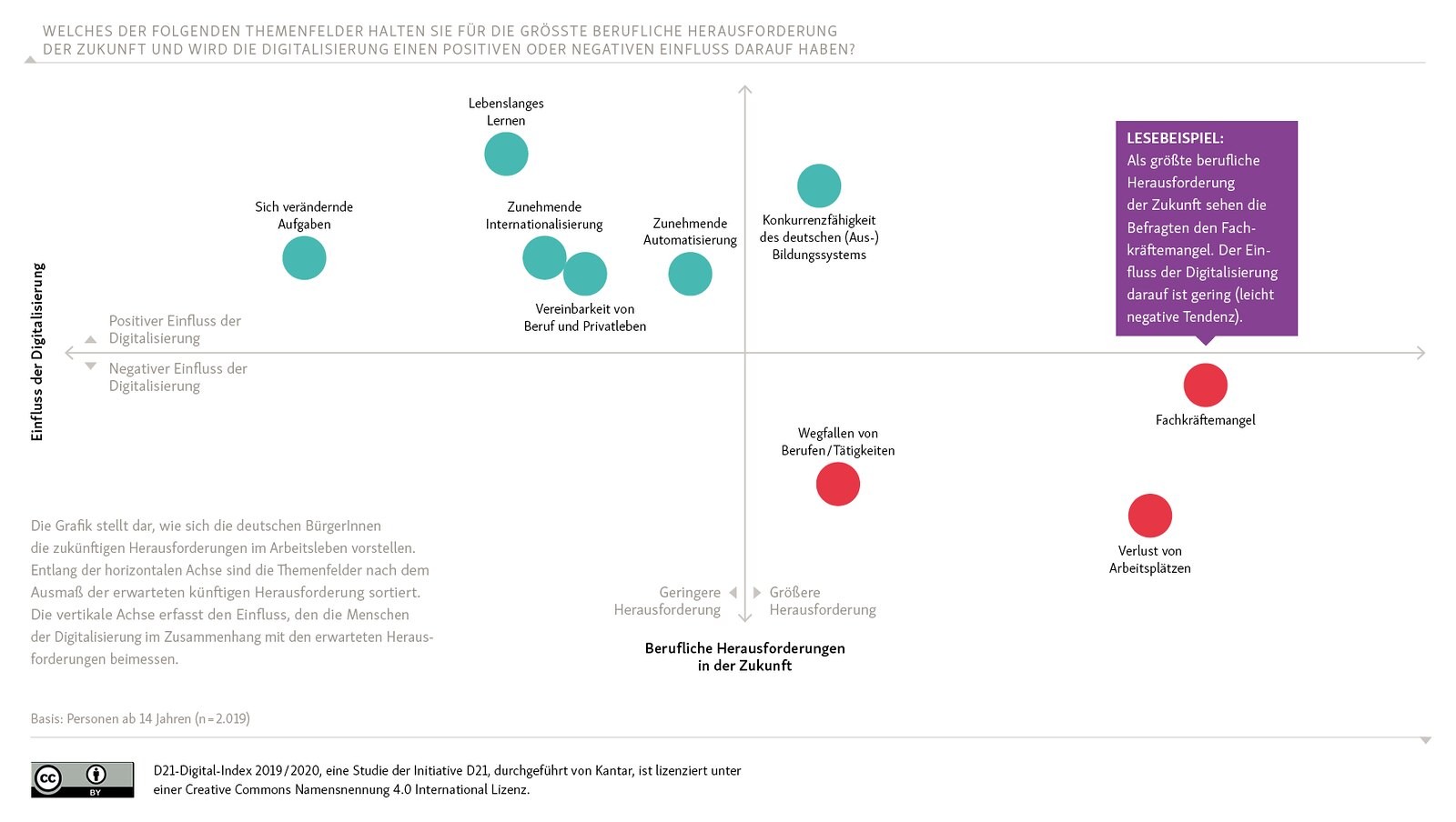 Den Beschäftigten in Deutschland ist, so zeigen unsere Zahlen, sehr klar, dass sich Berufe, Tätigkeiten und Kompetenzen im Zuge der Digitalisierung der Arbeit in Zukunft stark verändern werden. Das Positive dabei ist, dass die Mehrheit der Beschäftigten mit Offenheit und einer positiven Grundeinstellung auf diese Änderungen schaut. Sich verändernde Aufgaben, lebenslanges Lernen, die zunehmende Internationalisierung, die bessere Vereinbarkeit von Beruf und Privatleben, die zunehmende Automatisierung und die Stärkung der Zukunftsfähigkeit des deutschen Bildungssystems sind Themenbereiche, bei denen die Bevölkerung einen positiven Einfluss der Digitalisierung erwartet.