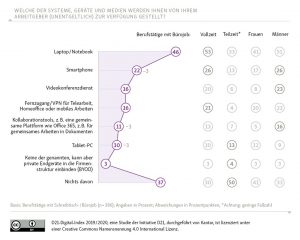 Die geringe Quote der mobil Arbeitenden muss umso mehr Anlass zum Nachdenken geben, als dass immerhin jeder zweite Beschäftigte in Deutschland einen Laptop für seine Arbeit nutzt. Wieso kann er oder sie dann damit nicht mobil arbeiten? Bedenklich erscheint auch, dass mit der Digitalisierung der Arbeit keine größere Chancengleichheit zwischen unterschiedlichen Gruppen der Bevölkerung einher zu gehen scheint. Der Anteil der Menschen in Vollzeit, die über einen Laptop, Smartphone, Videoconferencing-Tool, VPN oder ein digitales Werkzeug zur Zusammenarbeit verfügen, liegt um den Faktor 2-3 höher als der jeweilige Anteil der in Teilzeit Arbeitenden.