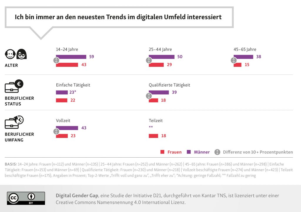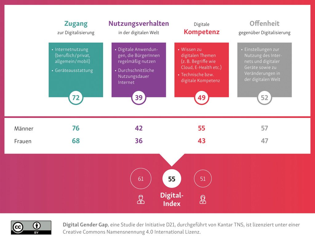 Die Studie „Digital Gender Gap – Lagebild zu Gender(un)gleichheiten in der digitalisierten Welt“ ist eine Sonderauswertung des D21-Digital-Index 2018/ 2019. Der Digital-Index misst jedes Jahr – zuletzt wurde er am 25.02.2020 aktualisiert – den Digitalisierungsgrad der deutschen Bevölkerung.