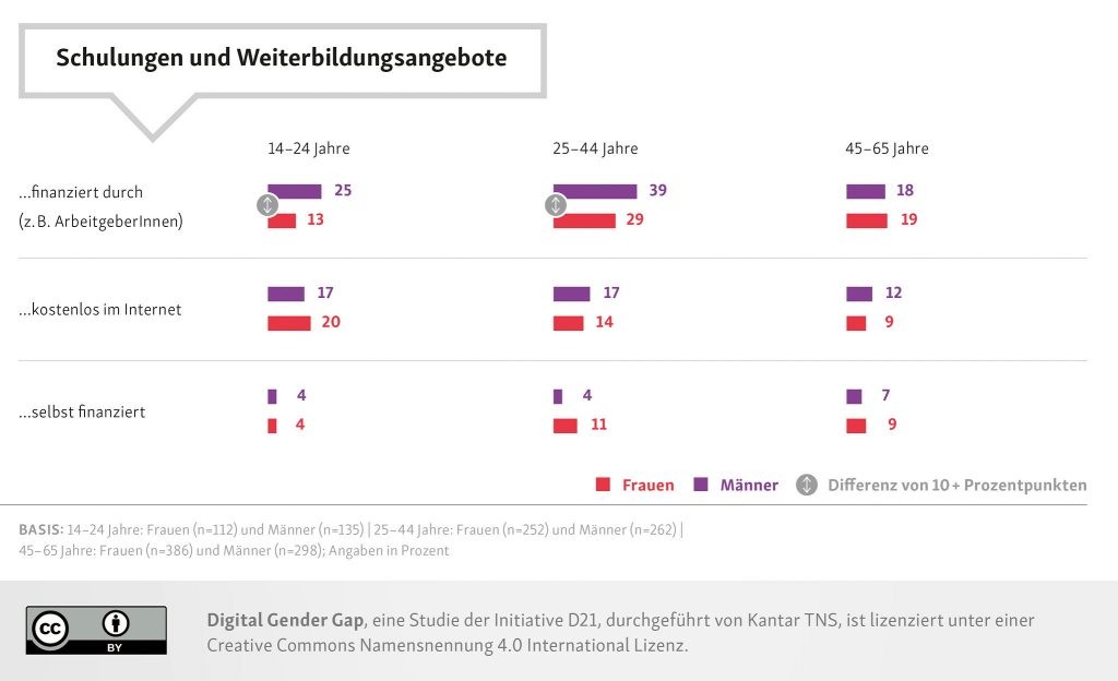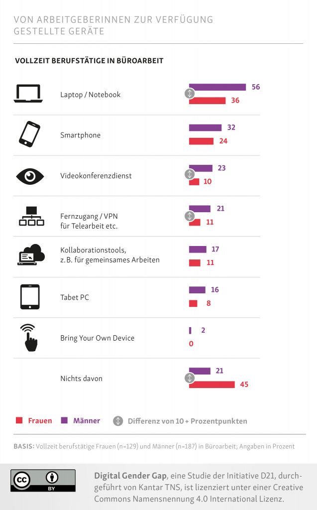 Schon an diesem Punkt wird ein Ungleichgewicht sichtbar: Von Arbeitgebern finanzierte Weiterbildungen zur Aneignung von digitalen Kompetenzen werden von Männern überwiegend häufiger in Anspruch genommen als von Frauen. Außerdem sind Männer deutlich besser mit mobilen Geräten und digitalen Anwendungen im Job ausgestattet als Frauen in vergleichbaren Arbeitsverhältnissen (Vollzeit in Büroarbeitsplätzen).