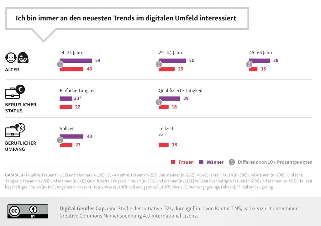 In allen untersuchten Bereichen (Zugang zur Digitalisierung, Nutzungsverhalten in der digitalen Welt, Digitale Kompetenz und Offenheit gegenüber Digitalisierung) sind die Werte von Männern höher als die von Frauen. Bei näherer Betrachtung wird deutlich, dass auch, wenn nach Altersgruppen differenziert wird, Frauen durchweg niedrigere Durchschnittswerte erzielen. Sie zählen überdurchschnittlich häufig zu den sogenannten „Digital Abseitsstehenden“. Männer dagegen bilden die Mehrheit der „Digitalen Vorreiter“.