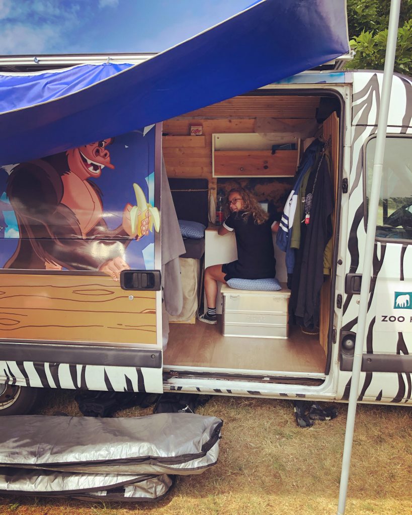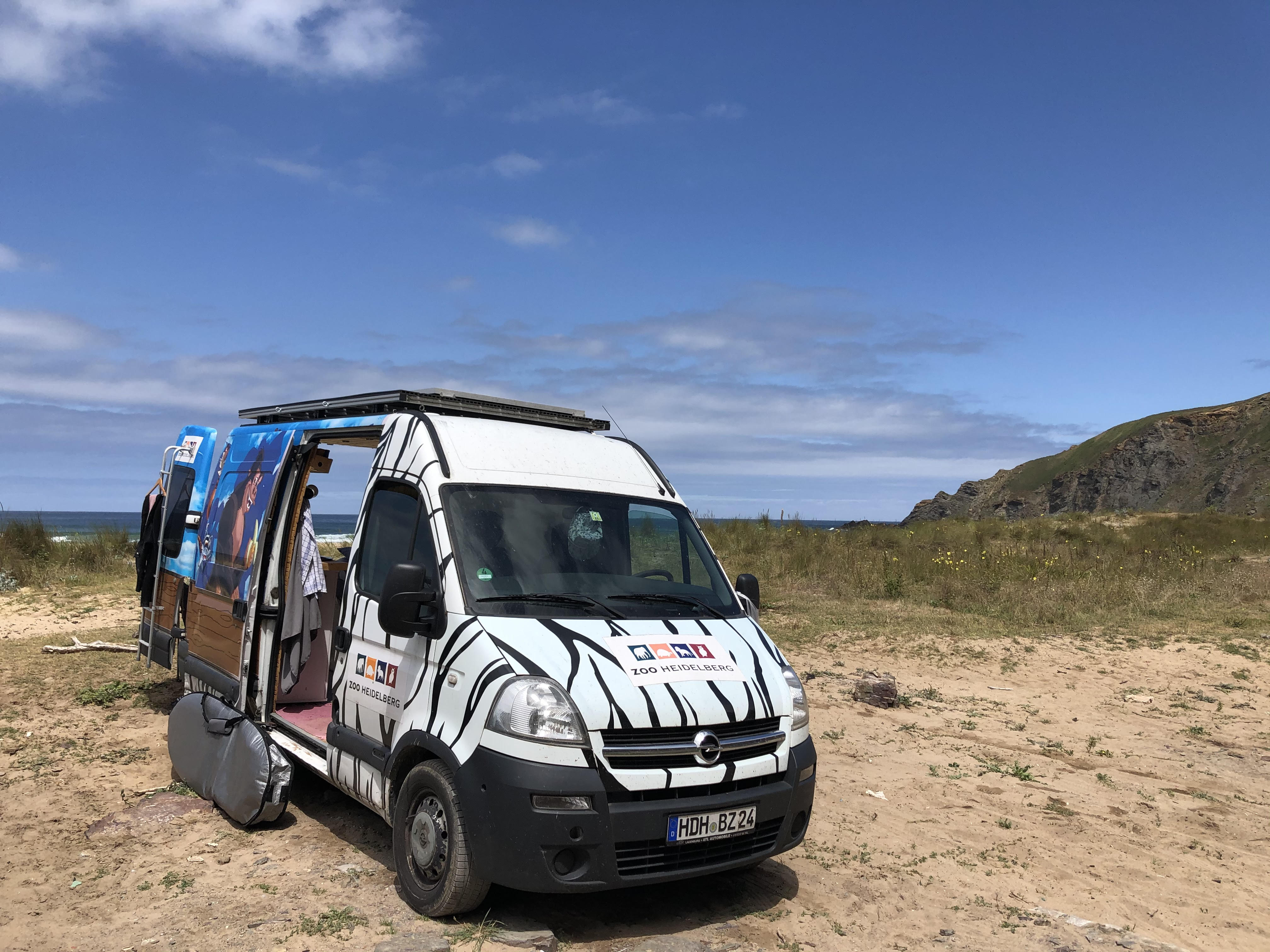 Seit Mai 2020 arbeite ich in einem zum Camper umgebauten Sprinter, dessen Ausstattung ich in den Monaten zuvor noch auf meine individuellen Bedürfnisse zugeschnitten habe. Der frühere Besitzer ist der Zoo Heidelberg, er hat großflächig Comic-Tiermotive auf das Fahrzeug folieren lassen – der Wiedererkennungswert könnte also kaum höher sein. Und auch, wenn er nicht so aussieht: