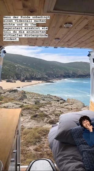 „Tolle Wallpaper, und so echt!“, staunte mein Kunde in der Videokonferenz. „Aber Moment mal, bewegt die sich etwa?“ „Ja“, entgegnete ich begeistert, „diese neuen animierten Hintergründe sind wirklich super realistisch.“ Der vermeintlich virtuelle Hintergrund war echt. Er zeigte eine offene Vantür, dahinter eine malerische Küste, blauen Himmel, einen menschenleeren Strand und das Meer – meinen neuen Arbeitsplatz. In dieser Videokonferenz am Strand, die mein Kunde im Juli 2020 kurzfristig anberaumt hatte, unterhielten wir uns nicht weiter über reale oder virtuelle Hintergründe, sondern gingen zur Tagesordnung über. Inzwischen wissen viele meiner Kunden wie ich arbeite, da wird zum Einstieg eines Calls schon mal darüber gesprochen, wo ich gerade bin, was ich dort so mache und wohin es als Nächstes geht.