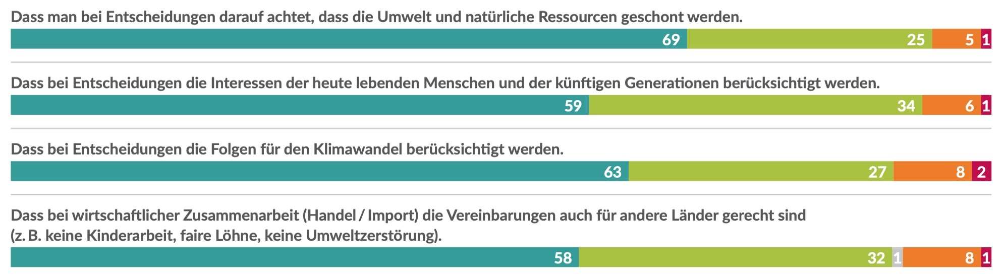 Die jungen Menschen wissen genau, dass der Begriff der „Nachhaltigkeit“ nicht nur eine ökologische sondern auch eine soziale und eine ökonomische Dimension beinhaltet. Schaut man sich an, was genau die jungen Menschen unter Nachhaltigkeit verstehen, so erkennt man sofort, dass die wesentlichen Elemente – relativ unabhängig vom Bildungsniveau – auch am häufigsten genannt werden. Der Kenntnisstand kann daher als sehr gut bezeichnet werden.