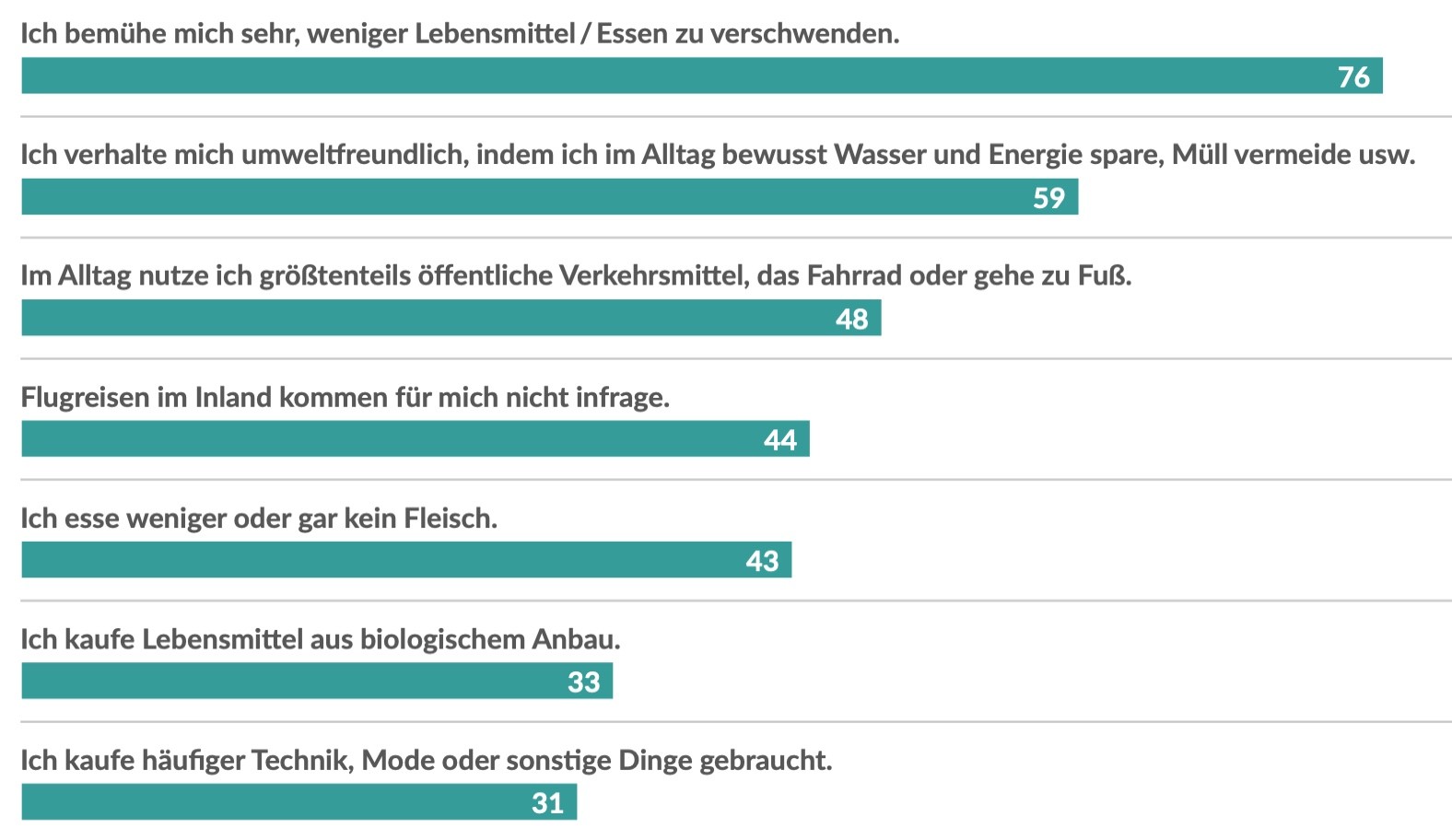 Der Blick auf die von den jungen Menschen präferierten Maßnahmen, um mehr Nachhaltigkeit in den eigenen Arbeits- und Lebensalltag zu implementieren, zeigt, dass die von älteren Menschen gern negativ konnotierte „Verzichts“debatte für die jungen Menschen genau umgekehrt bewertet wird: Verzicht ist ein wichtiges Werkzeug für die Erreichung von mehr Nachhaltigkeit. Bis auf den Punkt des Verzichts auf Fleisch (weitere Maßnahmen konnten hier aus Platzgründen nicht dargestellt werden) ist zudem auffällig, dass alle Maßnahmen Verhaltensmaximen sind, die die Nachkriegsgeneration noch als Selbstverständlichkeit empfunden hat, die aber in der dazwischen liegenden Generationen scheinbar verloren gegangen sind.