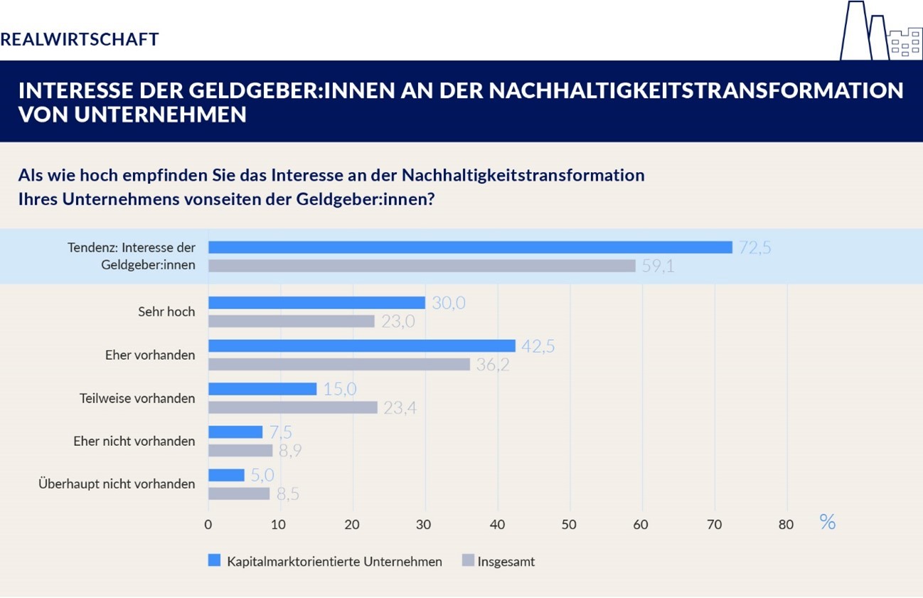 Erklärtes Ziel des Monitors ist es auch, die Verzahnung der Real- und Finanzwirtschaft im Bereich der Nachhaltigkeitstransformation abzubilden und Wege zu einem besseren Zusammenspiel aufzuzeigen. Hier zeigt sich bei den Ergebnissen des STM23, dass insbesondere bei kapitalmarktorientierten Unternehmen das Thema Nachhaltigkeit eine größere Rolle spielt als bei den übrigen Firmen. 73 Prozent von ihnen sagen, die Geldgeber:innen seien an der Nachhaltigkeitstransformation ihres Unternehmens interessiert. 56 Prozent geben an, das Thema sei „sehr wichtig“ oder „eher wichtig“ bei der Finanzierung Ihres Unternehmens.