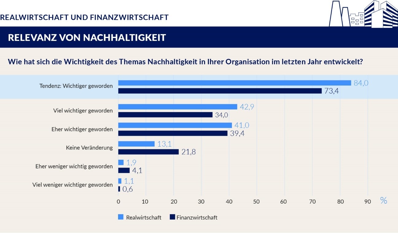Generell zeigt sich, dass das Thema Nachhaltigkeit etwas stärker im Bewusstsein der Realwirtschaft verankert ist, als in der Finanzwirtschaft, was sich zum einen durch einen höheren Grad an Exponiertheit realwirtschaftlicher Unternehmen gegenüber Konsumenten erklärt und zum anderen dadurch, dass in der Realwirtschaft bereits früher entsprechende Regulierungen stattgefunden haben.