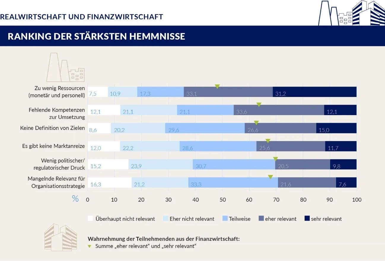 Konkrete Klimaziele hat sich bislang nur rund ein Drittel der Unternehmen der Realwirtschaft und lediglich ein Viertel der Finanzwirtschaft gegeben. Allerdings dürfte diese Zahl nach oben schnellen, denn 43 Prozent der Befragten aus der Realwirtschaft und 33 Prozent aus der Finanzwirtschaft geben an, die Formulierung von Klimazielen sei „in Vorbereitung“. Der Monitor zeigt auch, wo die größten Hemmnisse bei der Transformation liegen: bei der Ausstattung mit Ressourcen und der Umsetzungskompetenz in den Unternehmen. So nennen 64 Prozent der Vertreter:innen aus der Realwirtschaft mangelnde finanzielle und personelle Ausstattung als relevantes Hemmnis.