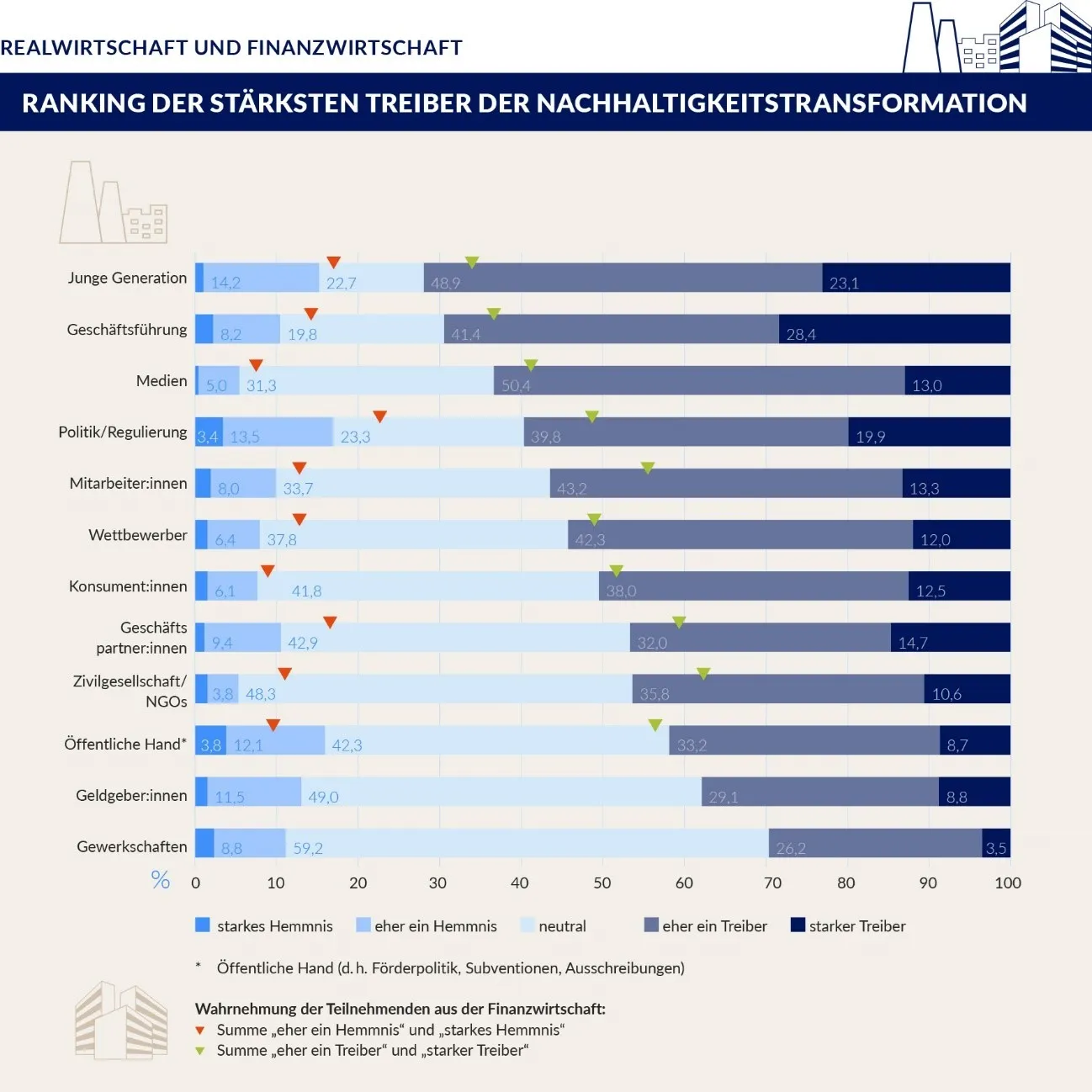 Eindeutig fällt die Antwort auf die Frage aus, wer die Treiber der Transformation sind. 72 Prozent der Befragten sehen die junge Generation als den wichtigsten Treiber. Doch stehen die Jugendlichen hier nicht allein da. Denn fast ebenso viele sehen ihre Geschäftsführung als diejenigen, die die Transformation voranbringen. An dritter Stelle werden die Medien genannt (64 Prozent). Nur wenige sehen die Gewerkschaften als Treiber (30 Prozent). Siehe auch Beitrag: Was halten junge Menschen vom Thema „Nachhaltigkeit“? – Zukunft der Nachhaltigkeit