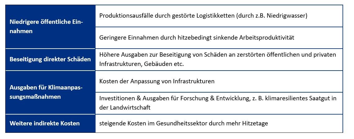 Die Ursachen dieser Kosten sind vielfältig, nur ein Teil quantifizierbar und damit „sichtbar“. Zum einen handelt es sich um Kosten, die durch direkte Schäden entstehen, zum anderen um Klimaanpassungskosten, sinkende Einnahmen sowie weitere indirekte Schäden wie nicht-monetäre Kosten für Umwelt und Gesundheit. Direkte Schäden wie die Überschwemmungen im Ahrtal sind leicht zu erfassen, andere Auswirkungen wie Ernteausfälle in der Landwirtschaft, Schäden an Wäldern oder Produktionsausfälle in der Industrie sind in Medienberichten sichtbar, ihre wirtschaftlichen und finanziellen Kosten (z.B. auch in Form von höheren öffentlichen Ausgaben oder Steuermindereinnahmen) lassen sich sehr schwer messen. Mehr und bessere Daten sind nötig, um die vollen „Kosten des Klimawandels“ zu verstehen.