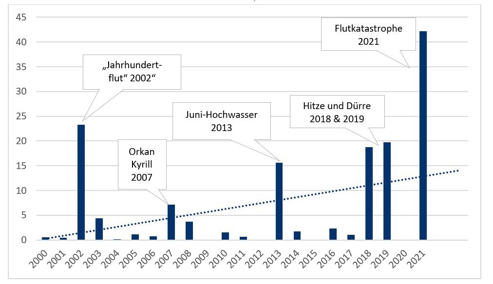 Daten der Rückversicherer zeigen: Schäden durch Extremwetterereignisse – wie Hitzeperioden, Überschwemmungen oder Starkregenereignisse – nehmen seit Jahrzehnten stetig zu. Die Grafik zeigt den Trend der (direkten) Schadenskosten im Zusammenhang mit Extremwetterereignissen seit 2000. Nicht nur in Deutschland, auch weltweit ist ein Großteil der Schäden nicht versichert. Regierungen werden in Folge von Schadensereignissen regelmäßig unter Druck stehen, mit öffentlichen Geldern nicht versicherte Schäden zu kompensieren.