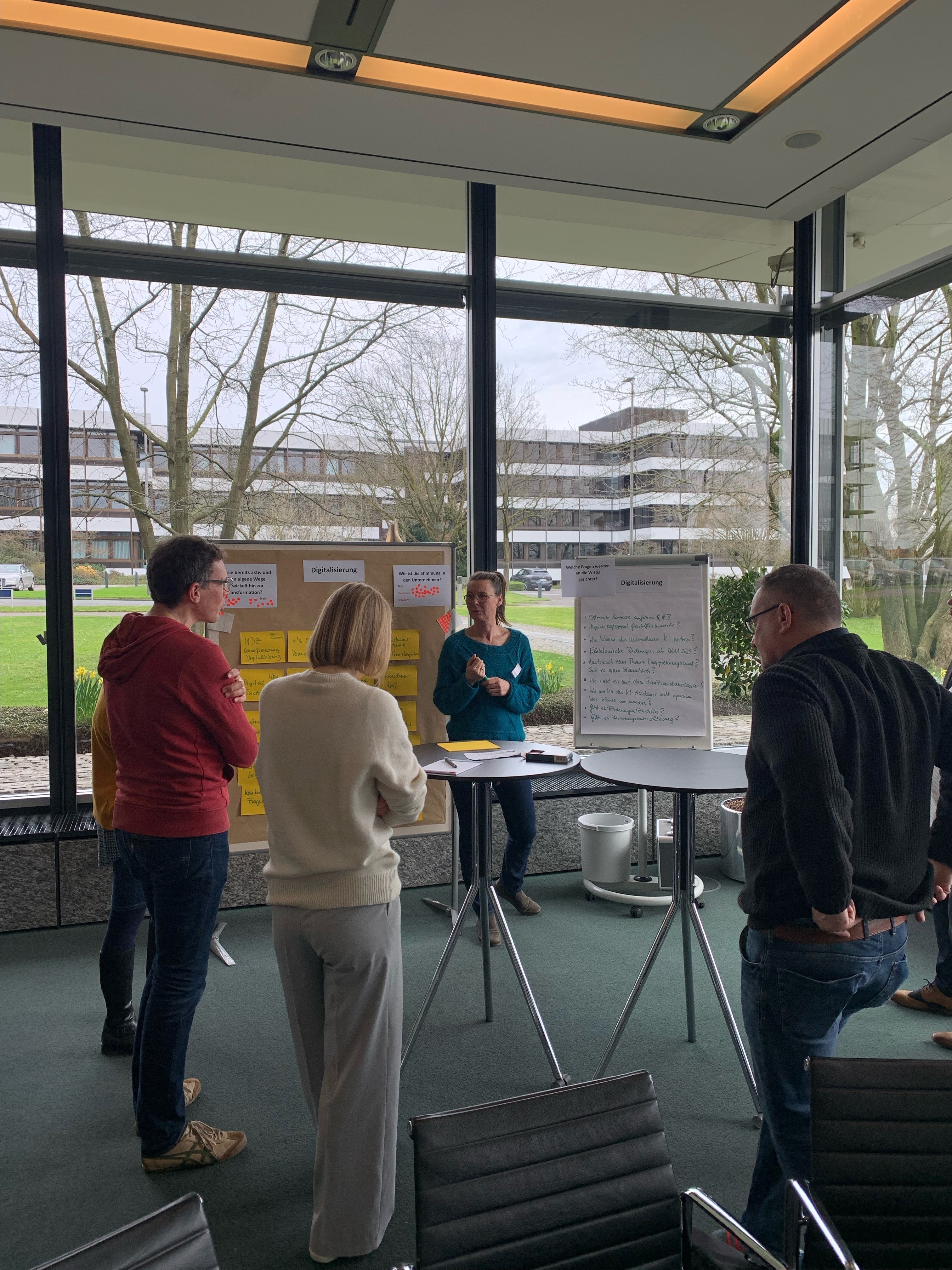 Den Auftakt zum Austausch machten Sebastian Czoske (Rheda-Wiedenbrück) und Stephan Langerjürgen (Herford), die jeweils einen interessanten Einblick in die Situation der Wirtschaftsförderungen bei sich vor Ort gaben. In vier Gruppen wurde dann intensiv drüber gesprochen, mit welchen Fragen zum Thema Nachhaltigkeit und Digitalisierung kleine und mittelgroße Unternehmen zu den Wirtschaftsförderungen kommen, wie die Stimmung bei den Unternehmen ist und welche Informationsangebote nachgefragt werden bzw. fehlen.