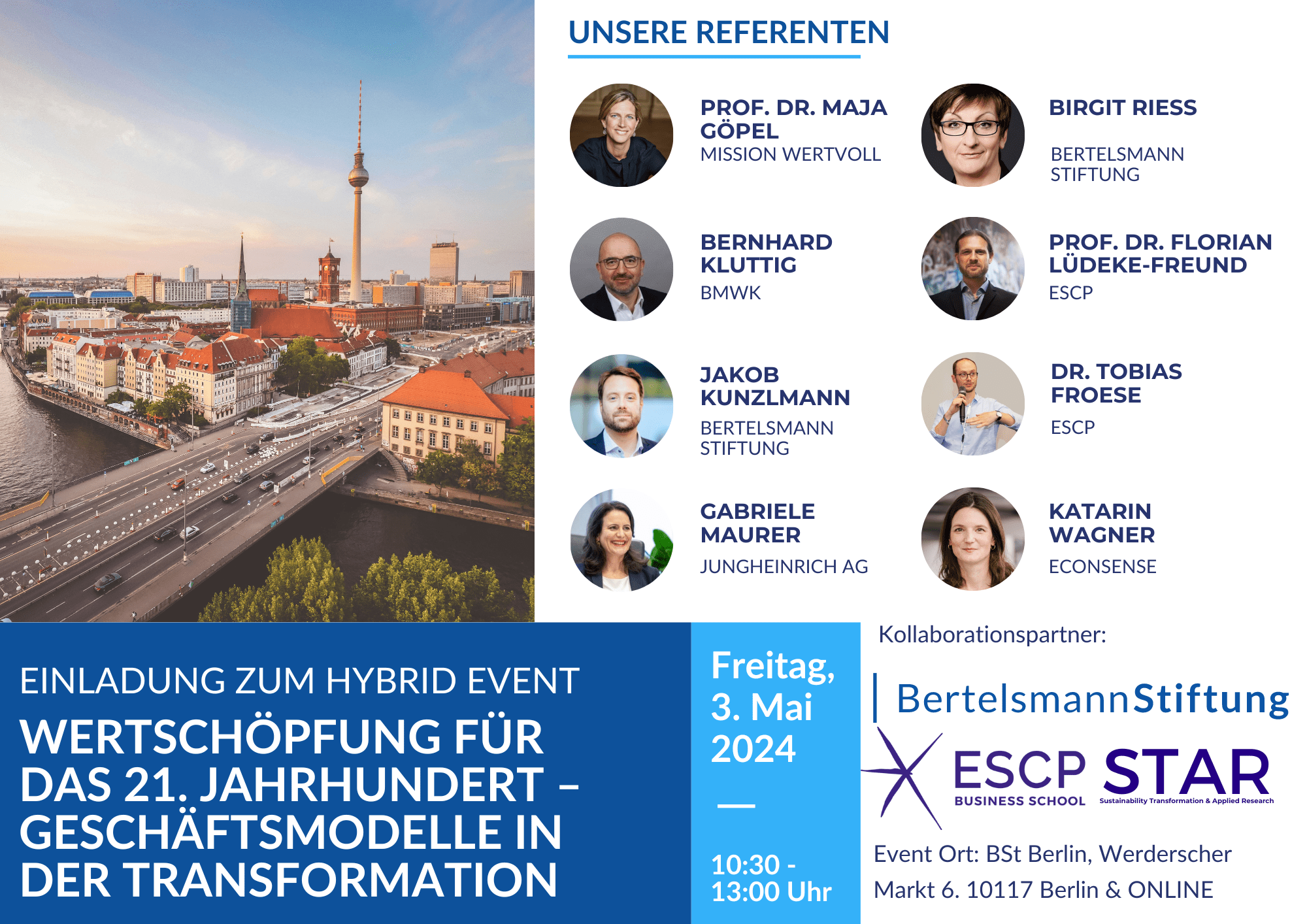 Unter der Autorenschaft von Prof. Dr. Florian Lüdeke-Freund und Dr. Tobias Froese haben die Bertelsmann Stiftung und die ESCP Business School hierzu die Fragen untersucht, wie es um den aktuellen Stand der Geschäftsmodelltransformation deutscher Unternehmen steht, welche Pfade und Formen solch Transformationen annehmen können und wie sich das hierbei Gelernte erfolgreich auf andere Unternehmen übertragen lässt. Die Ergebnisse dieser Forschung, welche in Print und E-Book Form veröffentlicht werden, wollen wir am 03.05.2024 gemeinsam mit Ihnen im Kreis namhafter Experten diskutieren.