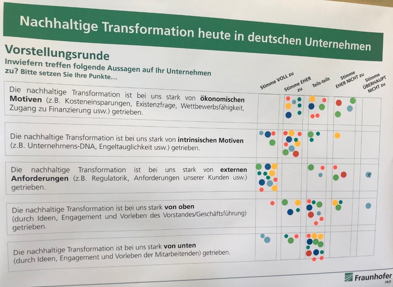 Unternehmen stehen vor der Herausforderung, die digitale und die nachhaltige Transformation gleichzeitig angehen zu müssen. Digitalisierung und Nachhaltigkeit üben dabei wechselseitigen Einfluss aus. Um sich über die vielen Anforderungen und Erfahrungen im Umgang mit dieser komplexen Entscheidersituation in Unternehmen auszutauschen, haben wir gemeinsam mit dem Team von Fraunhofer IAO aus Stuttgart mit innovativen Unternehmen eine Lernreise gestartet.
