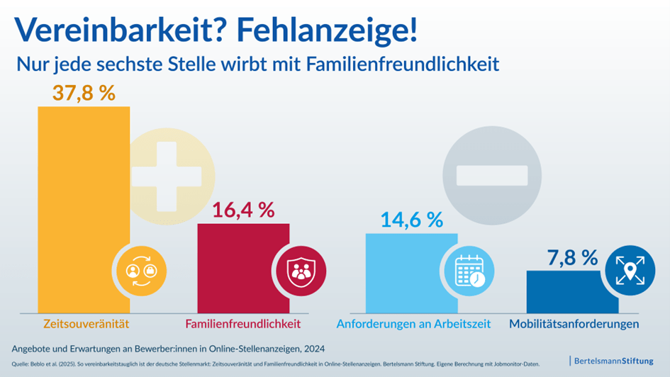 Zwar geben laut Unternehmensmonitor Familienfreundlichkeit (2023) rund 86 Prozent der Unternehmen an, dass ihnen familienfreundliche Maßnahmen wichtig seien. In den Stellenausschreibungen selbst zeigt sich dieses Bekenntnis jedoch kaum. Von den rund 8 Millionen Stellenanzeigen des Jahres 2024 enthielten lediglich 16,4 Prozent familienfreundliche Angebote. Nur 12 Prozent nannten Vereinbarkeit von Beruf und Privatleben explizit, und gerade einmal 2,7 Prozent boten Unterstützung bei der Kinderbetreuung. Etwas häufiger, aber ebenfalls nicht flächendeckend, wird Zeitsouveränität angeboten: 37,8 Prozent der Stellenanzeigen nannten vereinbarkeitstaugliche Arbeitszeitmodelle. Konkret bedeutet das: In 14 Prozent der Anzeigen können Bewerber:innen den Umfang ihrer Arbeitszeit selbst wählen, in 25 Prozent die Verteilung ihrer Wochenstunden.