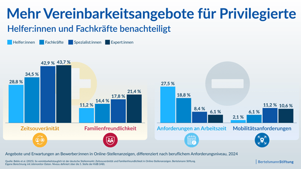 Auch beim Qualifikationsniveau zeigen sich Unterschiede. Wer über einen Meister oder Hochschulabschluss verfügt, muss einerseits flexibler sein und mehr Mobilitätsanforderungen erfüllen. Gleichzeitig bieten Arbeitgeber häufiger familienfreundliche Bedingungen. 21,4 Prozent der Anzeigen auf Expert:innenebene enthalten entsprechende Angebote, bei Helfer:innen sind es nur 11,2 Prozent. Auch bei der Arbeitszeitgestaltung zeigen sich Unterschiede: rund 44 Prozent der Expert:innenstellen bieten Zeitsouveränität, während es bei Helfer:innen nur rund 29 Prozent und bei Fachkräften mit Ausbildung 34,5 Prozent sind. Damit werden Beschäftigte mit geringerer oder mittlerer Qualifikation klar benachteiligt.