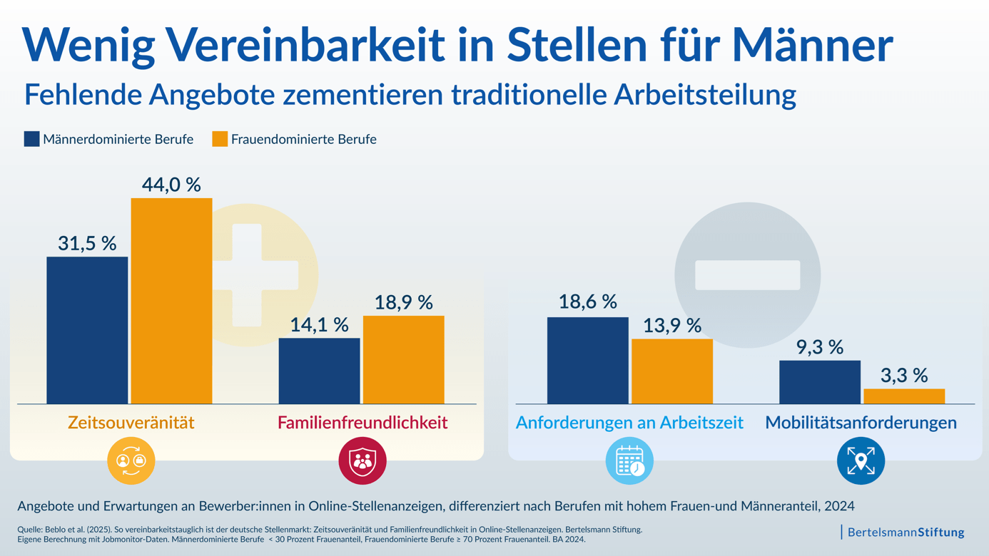 Besonders deutlich wird die Schieflage beim Vergleich von Berufen mit hohem Frauenanteil und bisher typischen Männerberufen. In frauendominierten Tätigkeiten , wie der Altenpflege oder Sozialarbeit, werben 44 Prozent der Stellenanzeigen mit Zeitsouveränität gegenüber 31,5 Prozent der Stellen für Männer. Konkret ermöglichen 24 Prozent der Anzeigen die Wahl des Arbeitsumfangs. In männerdominierten Tätigkeiten, etwa in der IT, gilt das nur für 7 Prozent. Zudem werden in Männerberufen häufiger Anforderungen wie Schichtdienst oder Rufbereitschaft formuliert (18,6 Prozent gegenüber 13,9 Prozent in Frauenberufen). Auch Mobilitätsanforderungen sind hier ausgeprägter. Diese Unterschiede verfestigen die Aufteilung in Frauen- und Männerberufe am Arbeitsmarkt und schränken die Wahlmöglichkeiten für alle Geschlechter ein.